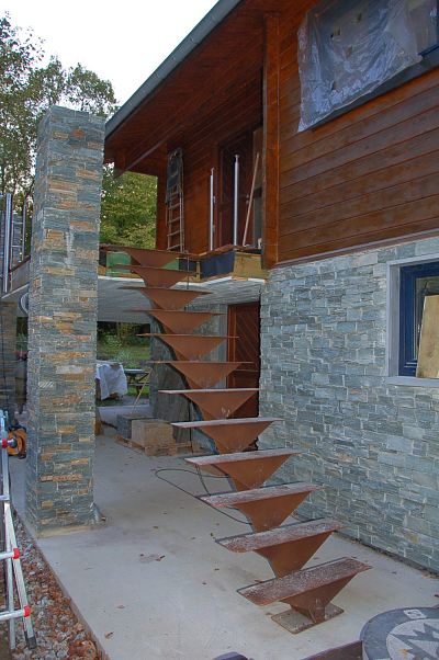 Dans un écrin de verdure à 100m de la route, autour d’un chalet en bois, aménagement d’une terrasse en hauteur de 45m2 et dessous, d’une terrasse couverte de 40m2 . Terrasse haute en bois exotique de type Ipé dont les fixations sont invisibles (Happax), garde corps sur mesure en tube d’inox et câbles tendu en inox. Escalier d’accès en acier brut et traité avec marche en pierre naturelle type schiste, comme les piliers de support.